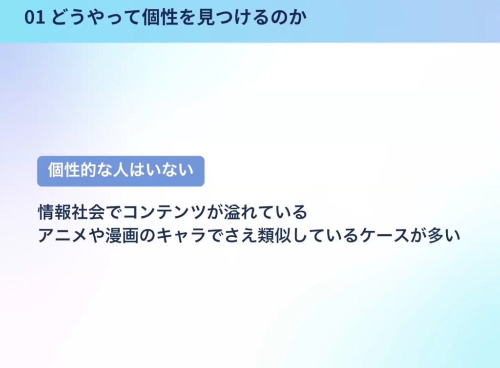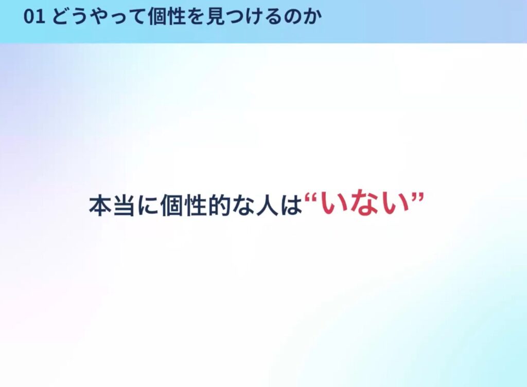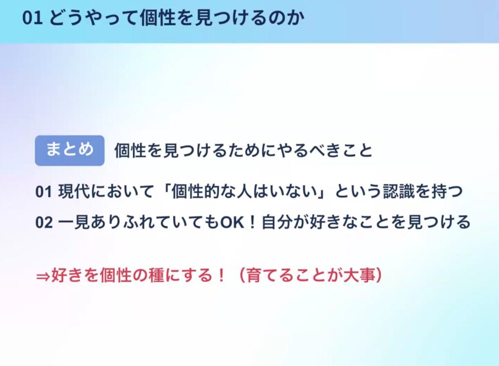 要するに、現代において本質的に「個性的な人」などいないということを前提に、自分の好きなことに注力し、それを個性として育てていくことが大事です。