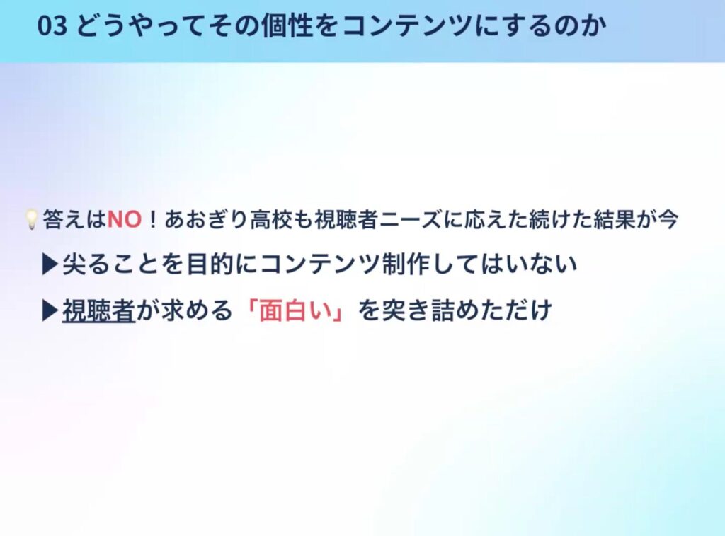 ただ視聴者の需要を考える必要はありますが、流行っているものを必ずやった方が良いというわけではなく、そうなってしまうと視聴者の「面白い」を意識しすぎている状態になります。