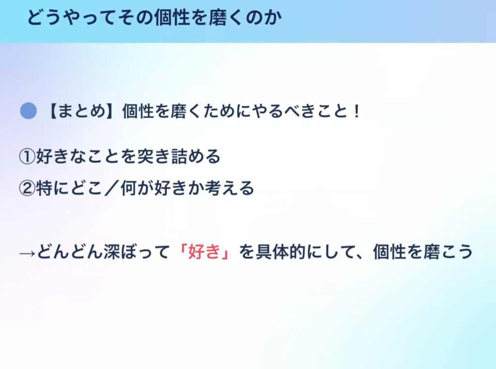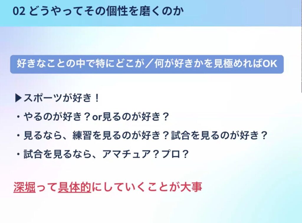 このように好きなものに対して、どうやって焦点を絞って深堀っていくのかが重要になり、始めに見つけた個性といったところがより洗練されていきます。