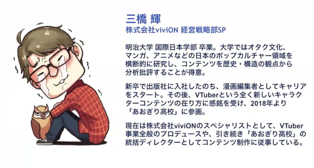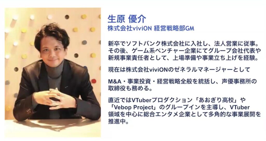2018年よりANYCOLOR株式会社でVTuber事業立ち上げに従事し、キャラクターを用いたコンテンツの企画/運用、企業案件配信の企画などを担当。現在は株式会社uyetにてVTuberを用いた新規事業開発、プロモーション事業、マーケティング事業、VTuber支援事業を展開。またJA全農様と朝日新聞社様と連携してライブコマースイベントを開催。