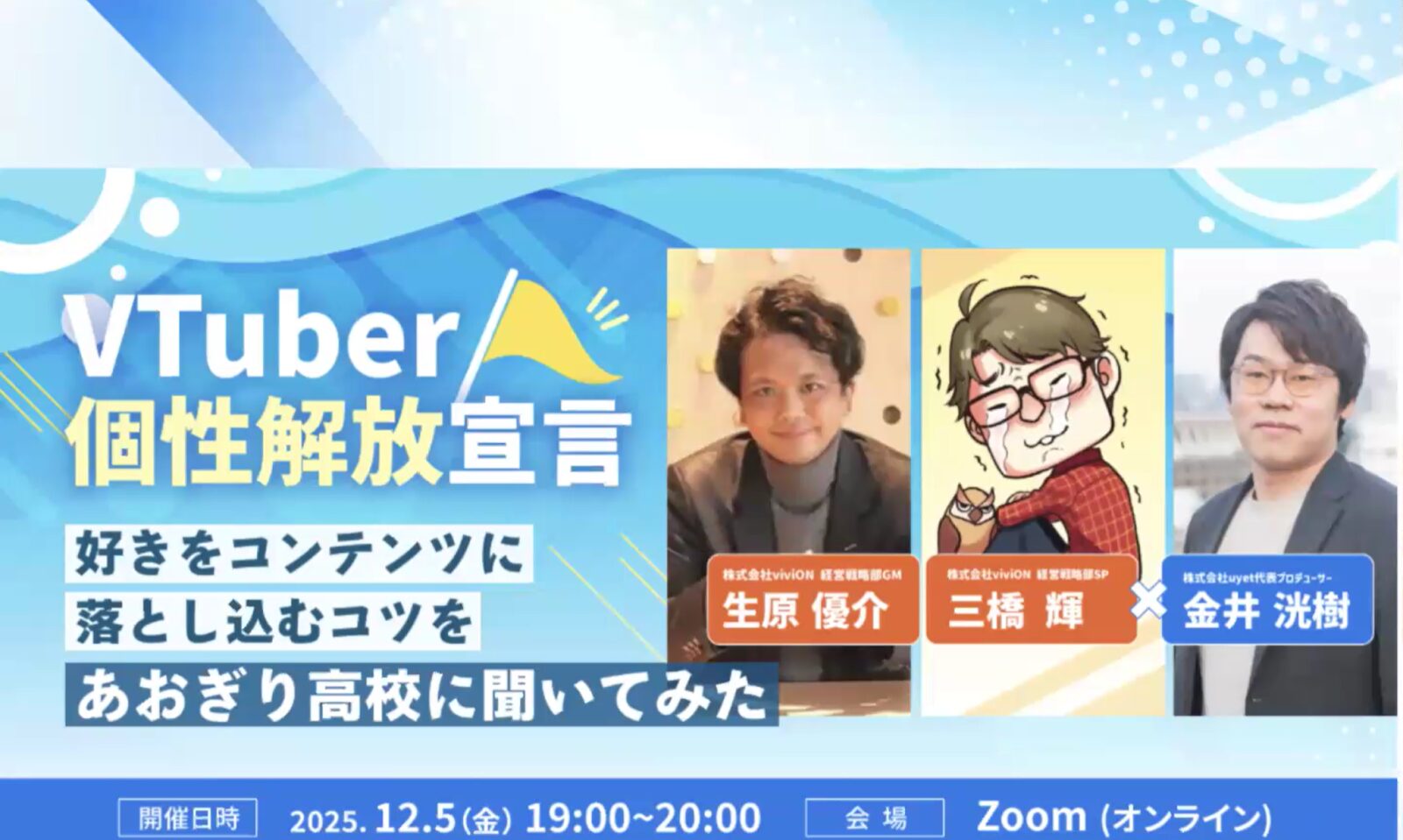 12月5日に開催させていただいたウェビナー「VTuber個性解放宣言〜好きをコンテンツに落とし込むコツをあおぎり高校に聞いてみた〜」ですが、多くの方にご参加いただき、大盛況の中で終えることができました。