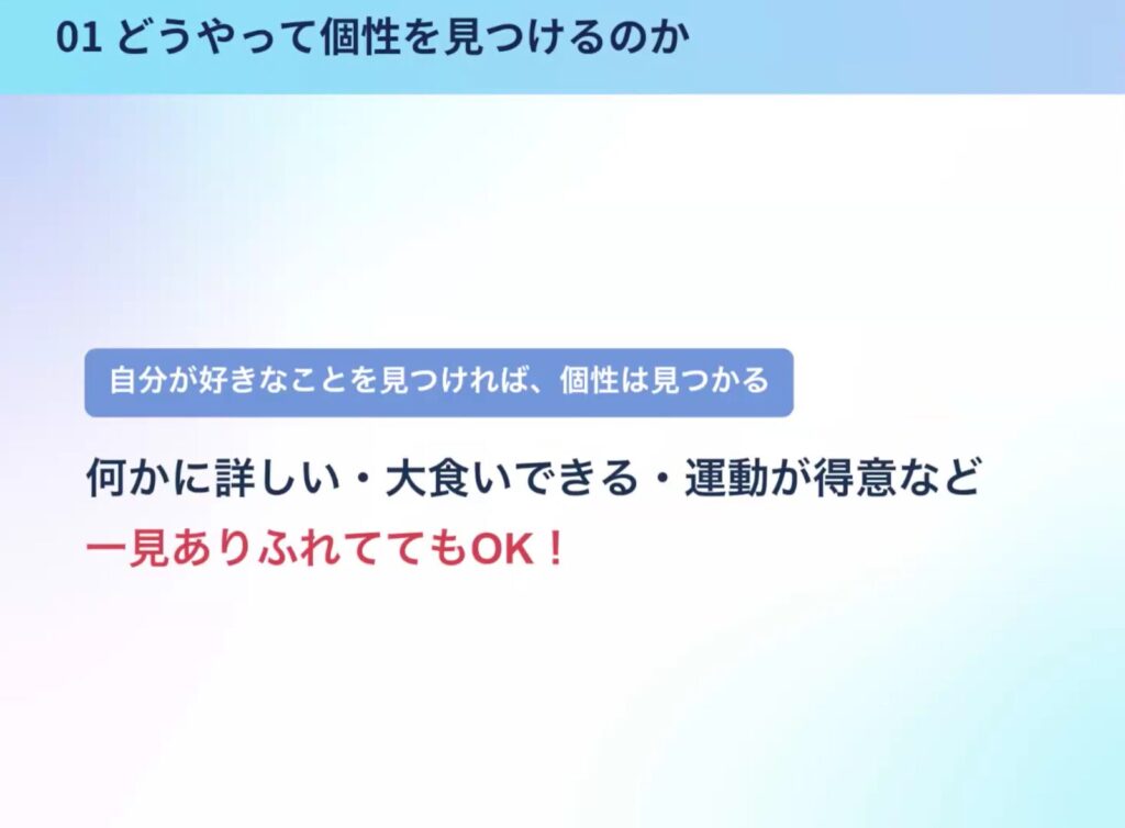 しかし、自分が好きなことを見つけたら個性は見つかってきます。