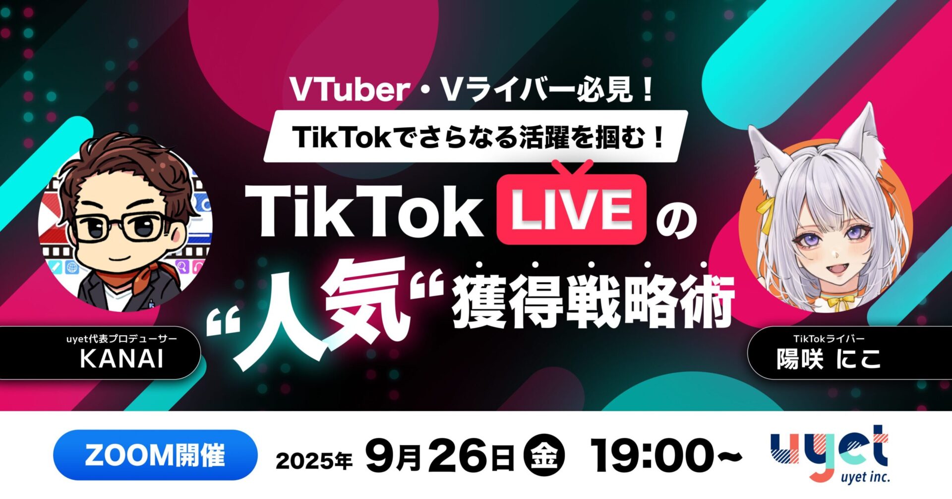 今回はTikTok LIVEを始めてみたいVTuberさん、Vライバーさんを対象にウェビナーを開催させていただきました。いかがだったでしょうか?ウェビナーにおいてご不明な点、詳しく知りたい点がございましたら株式会社uyetまでお気軽にお問い合わせください。