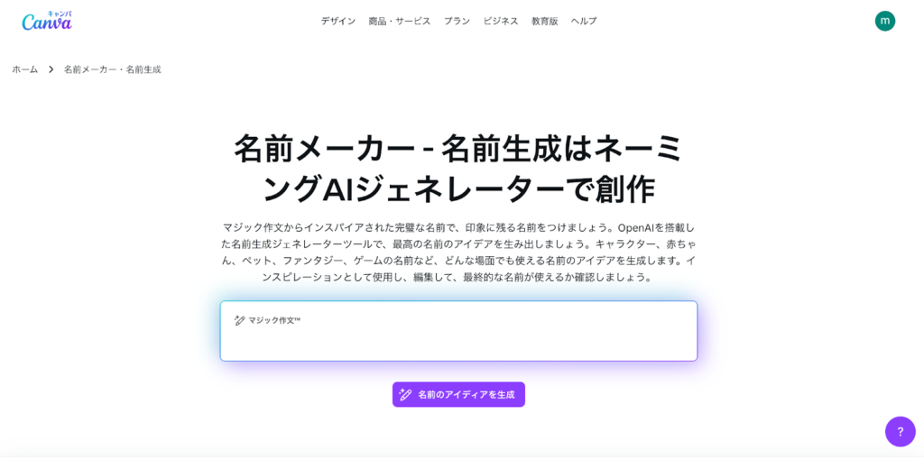 Canva「名前メーカー・名前生成」は、AIを活用したネーミングジェネレーターで、キーワードを入力することで名前の案を複数出してくれます。
