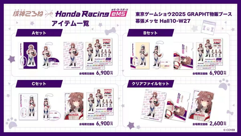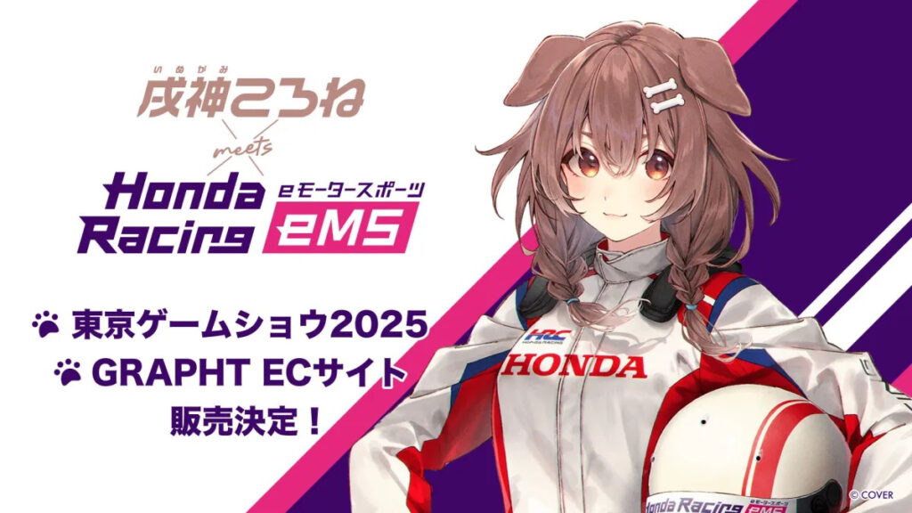 戌神ころねがホンダの公式モータースポーツイベント「Honda Racing eMS」とのコラボアイテムを発表し、東京ゲームショウ2025でグッズが発売されました。
