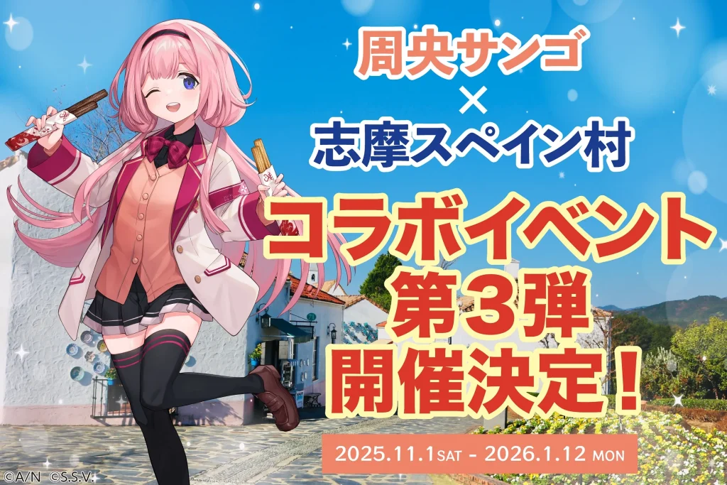 バーチャルライバーグループ・にじさんじ所属の周央サンゴさん(愛称:ンゴちゃん)と三重県のテーマパーク「志摩スペイン村」とのコラボイベント第3弾の開催が決定しました。開催期間は2025年11月1日から2026年1月12日までで、園内では周央サンゴさんと縁のあるライバーたちとのスペシャル企画として、周遊ラリー、アトラクション、コラボフードやオリジナルグッズ、フォトスポットなどが展開される予定です。