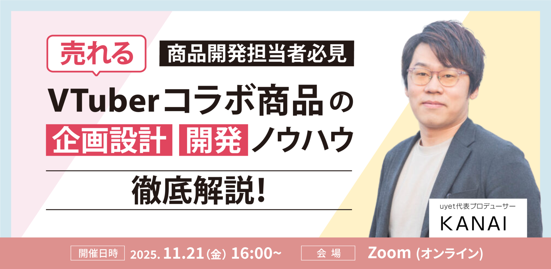 VTuber、IPコンテンツを通して日本と世界で新たな流通を生み出す“IPコンテンツの総合商社”株式会社uyet(ユエット)(本社:東京都渋谷区、代表取締役:梶田大樹)は、11月21日(金)16時より、VTuberの活用を検討している企業様向けのウェビナー「【企業担当者必見】売れるVTuber”コラボ商品“の企画設計、開発ノウハウを徹底解説!」を開催します。