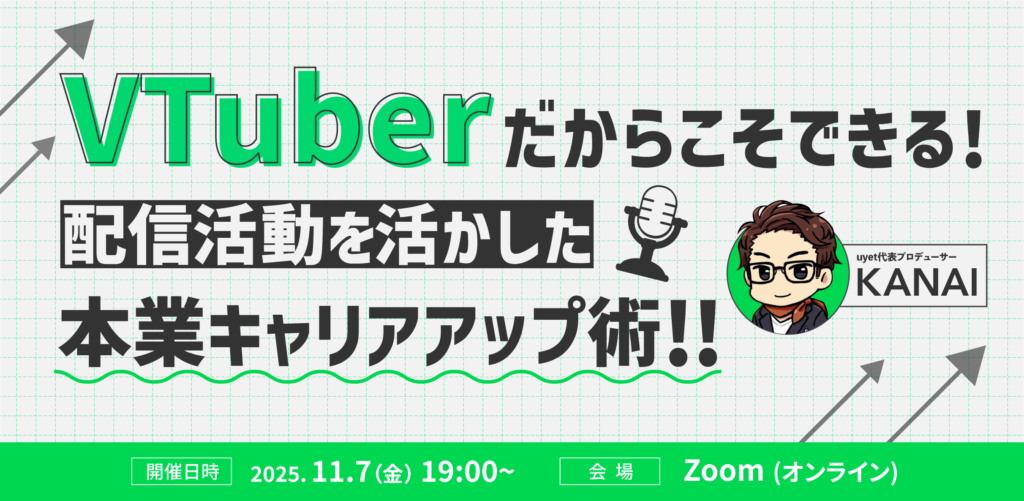 VTuberの方やVTuberに興味のある方向けに、「VTuberお悩み相談室」をオンラインで開催させていただいております。毎回一つテーマを通して、業界ナレッジや活動ノウハウにについてuyetの代表プロデューサーである金井がお話しさせていただいております。無料でご視聴いただけるものになっておりますので、ぜひご参加ください。